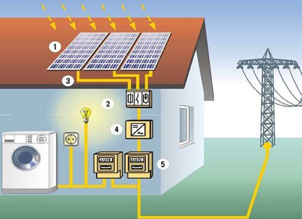 Các tấm pin năng lượng mặt trời được lắp đặt trên mái nhà có nhiệm vụ hấp thụ ánh sáng mặt trời, và chuyển hóa thành dòng điện một chiều. Dòng điện này sẽ được lưu trữ tại ắc quy, thông qua bộ kích điện để biến đổi thành dòng điện xoay chiều. Khi đó, dòng điện này sẽ được cung cấp tới các tải tiêu thụ trong gia đình.