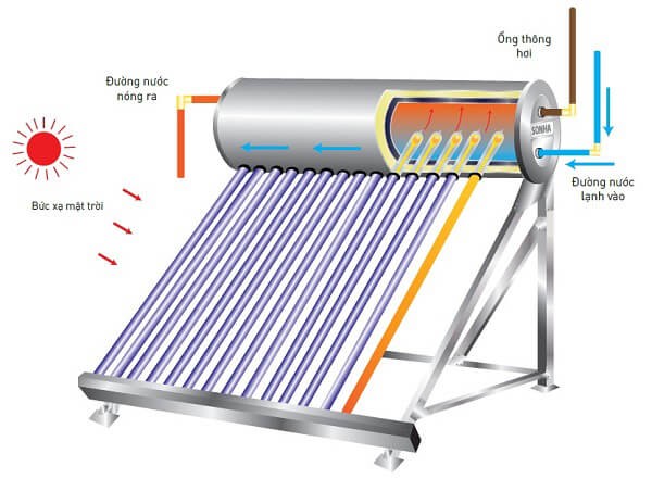 Máy nước nóng năng lượng mặt trời có 2 bộ phận chính là: bộ phận thu nhiệt và bộ phận giữ nhiệt: