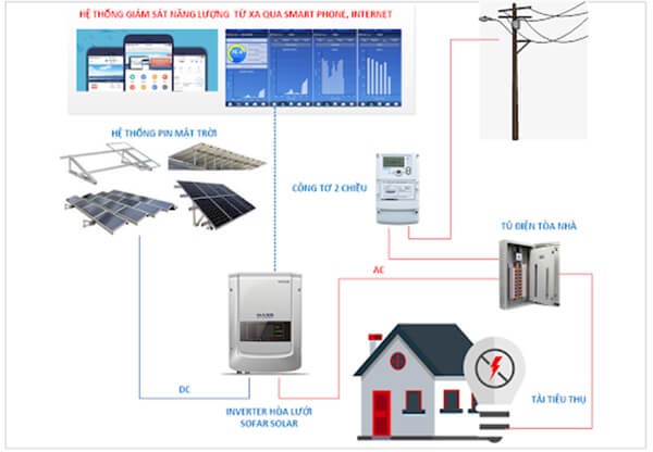 Nếu nguồn điện từ hệ thống điện mặt trời nhỏ hơn tải tiêu thụ, hệ thống sẽ tự động lấy thêm điện từ điện lưới để cung cấp đủ cho các tải tiêu thụ. Nếu nguồn điện từ hệ thống điện mặt trời lớn hơn tải tiêu thụ, nguồn điện dư ra từ điện mặt trời sẽ được trả ra điện lưới. Khi nguồn điện từ hệ thống điện mặt trời bằng tải tiêu thụ, tải tiêu thụ sẽ ưu tiên sử dụng nguồn điện năng lượng mặt trời.